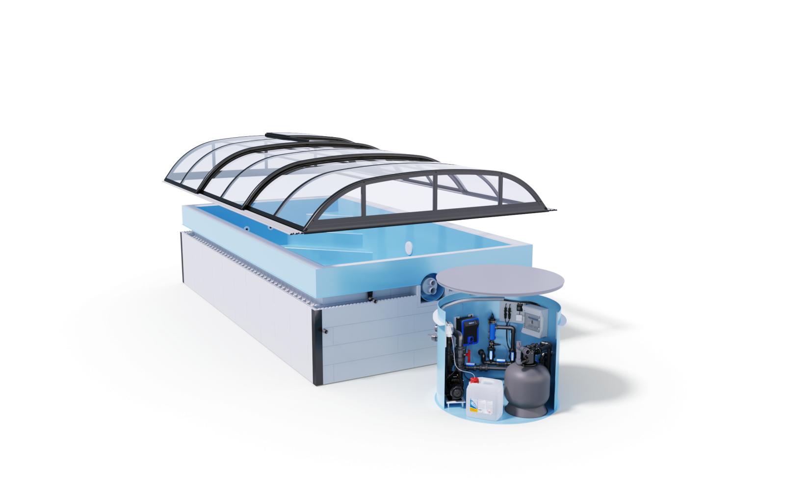 Anpassungsfähigkeit der technologischen Wände oder Schächte, die mit der gesamten erforderlichen Technik ausgestattet sind, einschließlich einer Salzanlage zur Salzwasseraufbereitung und einer intelligenten Steuerung der Pooltechnik.